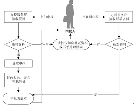 (1)办税服务厅接收纳税人资料或纳税人通过互联网络申报后提交的纸质资料,核对资料是否齐全、是否符合法定形式、填写内容是否完整,符合的即时办结;不符合的当场一次性告知应补正资料或不予受理原因。