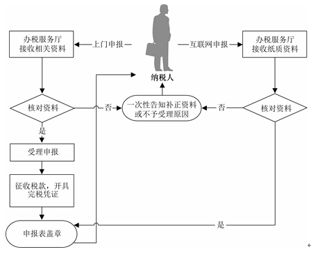 (1)办税服务厅接收申报人资料或申报人通过互联网络申报后提交的纸质资料,核对申报人报送资料是否齐全、是否符合法定形式、填写内容是否完整,符合的即时办结;不符合的当场一次性告知申报人应补正资料或不予受理原因。